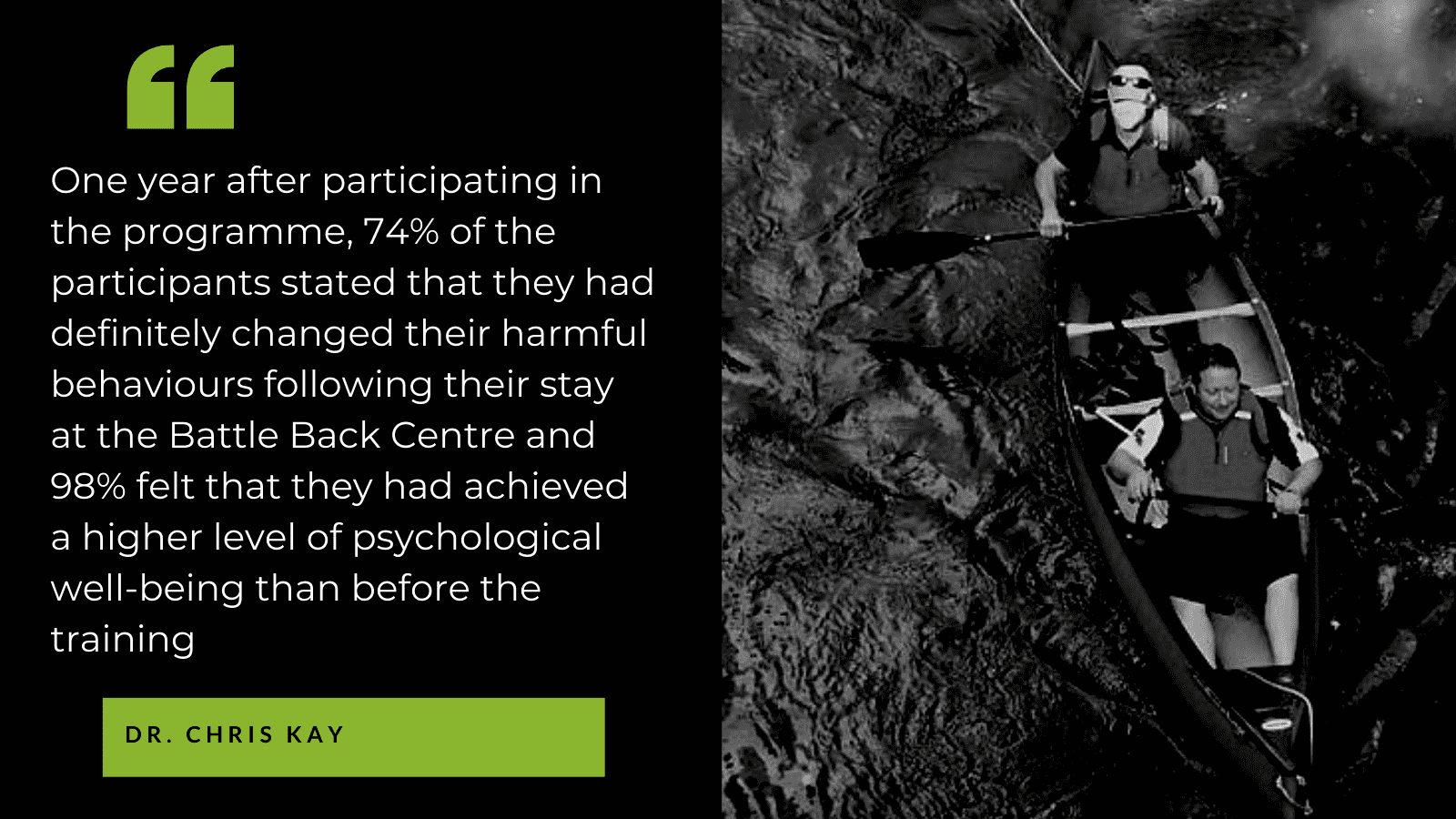 Participants also reported the types of things they have changed in their lives since attending a course. Twelve months after, 74% of them stated they had maintained positive changes in their behaviour (e.g. reducing alcohol consumption & smoking) following their stay at the Battle Back Centre and 98% of all reported changes in behaviour aligned with improved levels of psychological well-being.